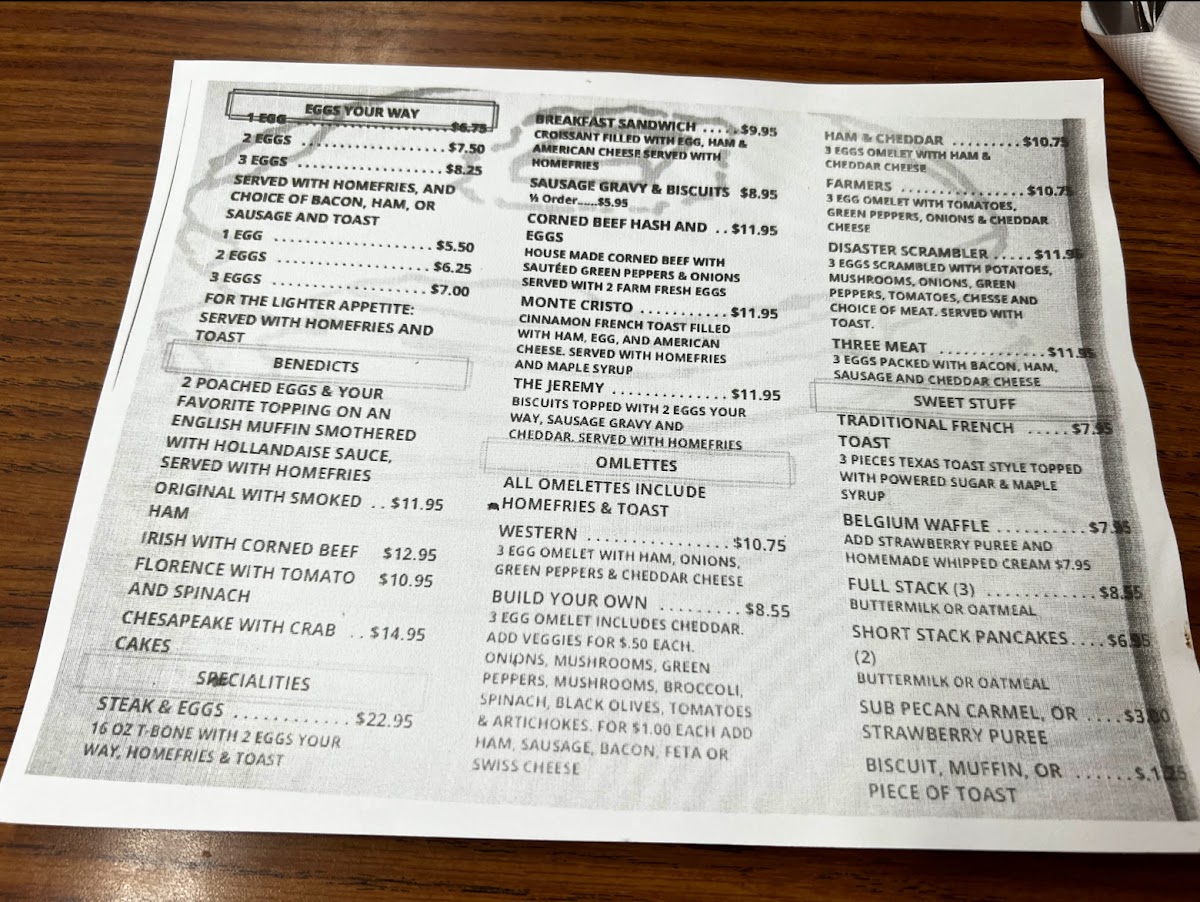 Breakfast favorites like scrambled eggs with bacon and potatoes, eggs Benedict with home fries, and various omelets provide reliable morning choices, served until noon. For lunch and dinner, hearty options such as the footlong chili dog, brisket dinner special, and club sandwich with onion rings match the welcoming, unhurried atmosphere. The presence of a soup and salad bar alongside a breakfast buffet allows for flexible, casual dining whether alone or with a group.
